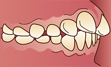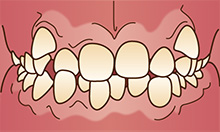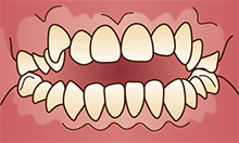 叢生(そうせい)とは、顎に歯が並びきることができず、歯が歯列から飛び出してしまったり、重なり合っている状態のことです。八重歯などもその症状の一つです。歯ブラシが届きにくいため、歯周病やむし歯などの原因になることも多いので早期に改善する必要があります。